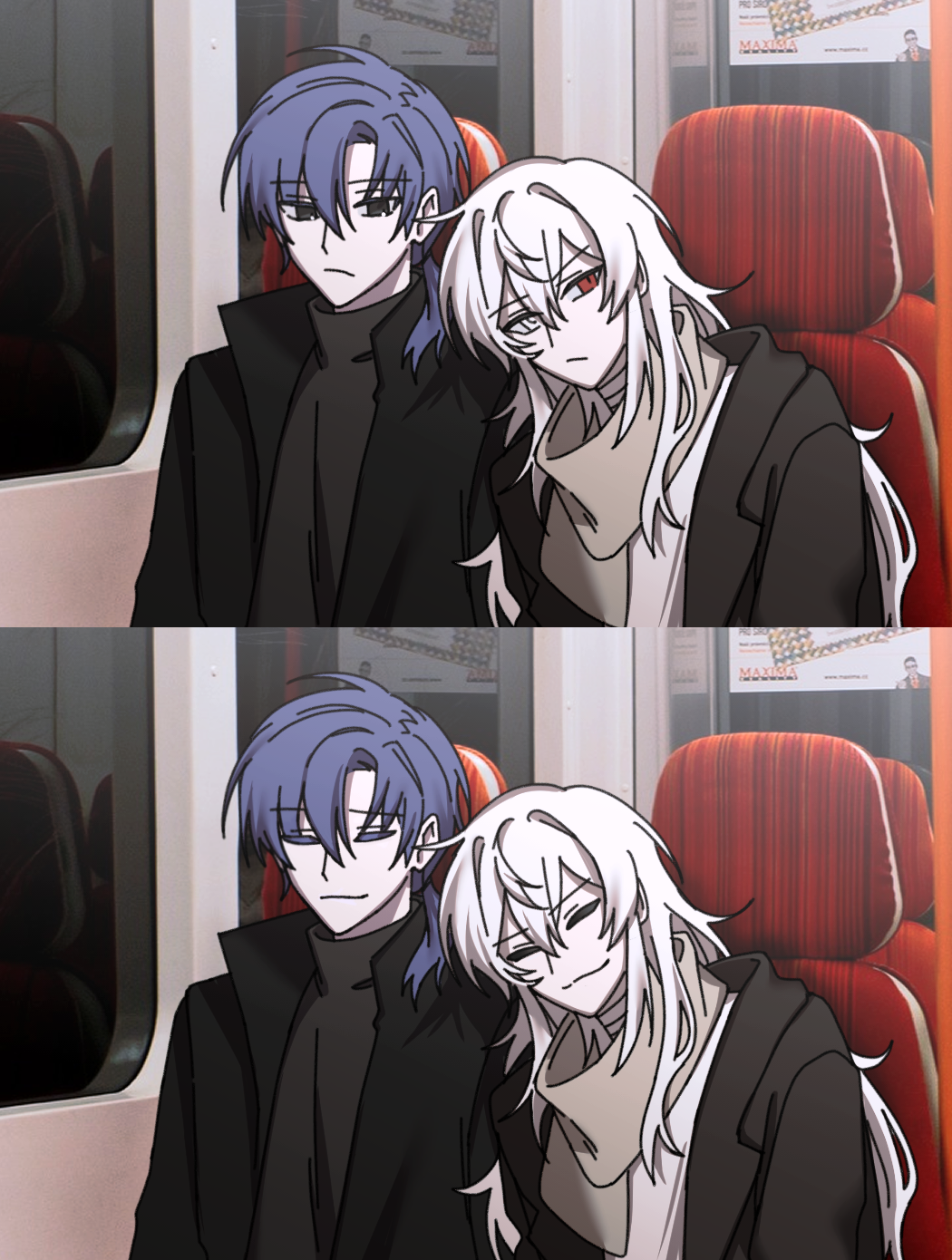 둘이 같임무 하러가면서 기차 옆자리에 앉은 상상함